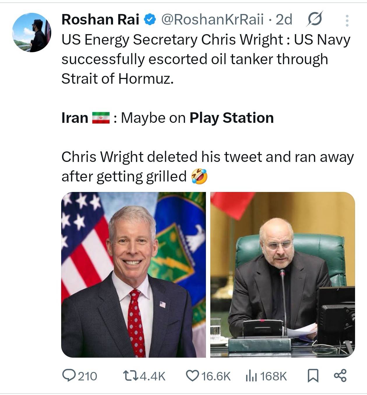 The Iranian Parliament Speaker, Mohammad Bagher Ghalibaf, captured the post before it was removed and mocked it on social media, joking that the escort may have existed “on PlayStation.” His message gained massive engagement and became one of the most widely viewed Iranian government posts during the crisis, with twenty-one thousand likes, 4,700 retweets and one million views.